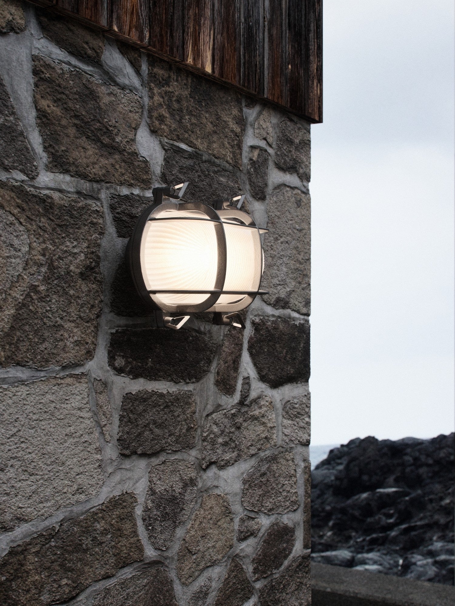 The Helford wall lamp draws inspiration from the harsh Nordic weather, with its rugged landscapes and roaring seas. Its maritime design emphasizes raw and rustic elements, making Helford a striking decorative piece for your front door, garage, or fence.
